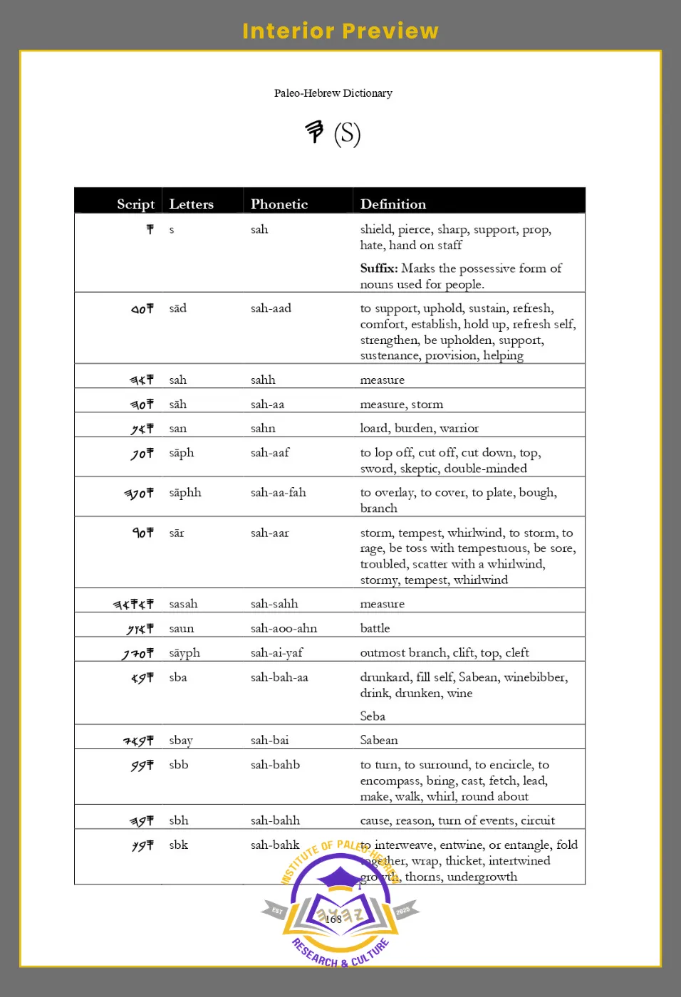 Rather than presenting Paleo-Hebrew as an academic specialty, this dictionary is designed as a practical reference—one that helps you recognize the script, sound out words, and understand their core meanings in a consistent, easy-to-use format.