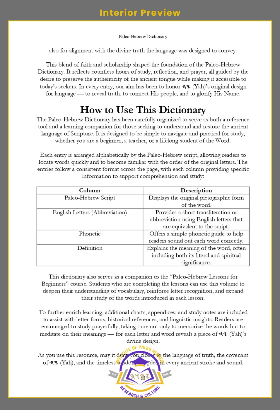 Preorder the Paleo-Hebrew Dictionary (Hardcover, First Edition) — a comprehensive reference restoring the original Scriptural language. This edition features over 6,400 Paleo-Hebrew words with pictographic script, pronunciation, and meaning.
